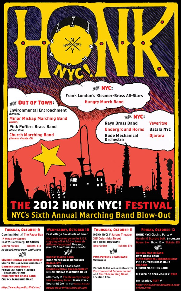 * (We’ve changed the name of the NYC festival from BONK! The Brooklyn HONK! Festival to HONK NYC! in honor of our parent festival in Somerville, MA: The HONK! Festival of Activist Street Bands.)