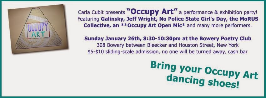 Hey again bloggers or whoever could be reading this blog. Occupy Art is here again. Well actually it’s Occupy Art is almost here again as I type this blog post. And I know Occupy Art is almost here again because that Occupy Art Show @ Bowery Poetry Facebook event invite says so. And so today finds itself as Occupy Wall Street Day 900 and something, I think….. And Occupy Wall Street is still moving fast, well sort of fast. And actually Occupy Art was already here before on this blog at Theater For The New City a couple of years ago. It’s just that this time that Occupy Art Show finds itself at The Bowery Poetry Club, that finds itself in that city of New York, that finds itself in that neighborhood of the Lower East Side that now calls itself the East Village for real estate marketing purposes, maybe. And so I thought that this would be a good reason to drag this Occupy Art blog out of the blogger closet again that has been collecting blogger dust since its last post a couple of years ago. Oh, and ditto a few days later…. and that Occupy Art Photo that Galinsky posted on his Facebook page, well that’s just Occupy Art cool. And that Occupy Art Show event invite reads as follows: