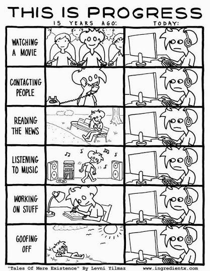Hey again bloggers or whoever could be reading this blagh. And even when that Google page rank update still wants to send me in search of a fifth full time job for when that get rich internet quick does not get rich internet quick, I still find myself blaghing for some reason or another. And I know I have posted these zombie apocalypse posts on this blog before. It’s just that when I keep reading articles such as The anxiety of unplugging and why we should disconnect to connect, and coming across photos like that This Is Progress photo that finds itself posted above and then videos with titles like The Innovation of Loneliness and what Facebook is doing to us that also finds itself posted above, it just brings me back to images of the zombie apocalypse and the robot nation again of wherever people are gathered these days and times, and that’s not even including my travels throughout planet earth on the streets, planes, trains, buses, boats or whatever social situation or traveling mode that one may find themselves in only to be surrounded by people staring at handheld devices with blue light emanating from them and fidgeting with handheld gadgets as if in a trance and life amongst humanity seems as if it is a scene out of a science fiction movie sometimes. And this scenario seems as if it is a world wide phenomenon these days and times. What has technology done to humanity, for better or for worse. And what if anything, does this have to do with a No Police State.![]()
