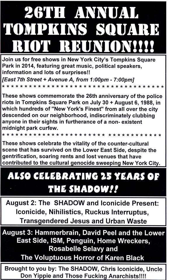 Hey again bloggers or whoever could be reading this blagh. And so I’m planning on going to this 26th Annual Tompkins Square Park Riot Reunion Concert Saturday, August 2nd, at some point in the afternoon to sing my No Police State Song in Tompkins Square Park, that park that finds itself in that neighborhood of the Lower East Side, now called the East Village for real estate marketing purposes maybe, that finds itself in that City of New York. And The Shadow’s description of this event describes it as follows. Hope to see you then.: