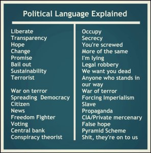 And I think I must be running out of things to blagh about on this blogging day when I start posting photos like those ones that find themselves posted above in my attempt to maintain web 2.0 social media user generated content for this blog whenever bloggers block possible. And those photos that I came across throughout my travels in internetland on this internet day read something like “VOTE FOR THE POLITICIAN YOU CAN TRUST (with that A for anarchist symbol below those words and then above the words Nobody 2012.” And then there’s that other photo I came across in facebookland that reads something like “Freedom Is A State Of Mind. Political Language Explained. Liberate/Occupy. Transparency/Secrecy. Hope/You’re Screwed. Change/More of the same. Promise/I’m lying. Bail out/Legal robbery. Sustainability/We want you dead. Terrorist/Anyone who stands in our way. War on terror/War of terror. Spreading Democracy/Forcing Imperialism. Citizen/Slave. News/Propaganda. Freedom Fighter/CIA/Private mercenary. Voting/False hope. Central bank/Pyramid Scheme. Conspiracy theorist/Shit, they’re on to us”. And even with those headline news of the day having something to do with that vote for us of a Republican National Convention and a don’t vote for them of an Occupy Tampa and that Hurricane Isaac threatening to wipe and wash everyone out to sea, and gun violence seeming to be never ending so much that that satirical of a newspaper The Onion finds itself with headlines that read Nation Celebrates Full Week Without Deadly Mass Shooting, and those states of New York and New Jersey find themselves under a Frack is wack frack attack, today still finds itself as Occupy Wall Street Day 347, a few weeks before the anniversary of that global revolution. And Occupy Wall Street is still moving fast. And what, if anything, does this have to do with a No Police State. Occupy Wall Street Worldwide.