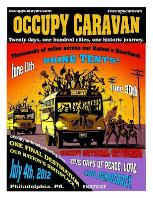 “Occupy Mississippi: Occupy Caravan will be coming through Jackson!! Great time to meet occupiers from all over the country and get involved (or back into) the movement! We will post more details as soon as they become available!” And that text from that poster that finds itself posted above reads something like: “Occupy Caravan. Twenty days, one hundred cities, one historic journey. Thousand of miles across our nations heartland. June 11th. Bring tents. June 30th. Occupy National Gathering. Our final destination. Our nations birthplace. July 4th, 2012. Philadelphia, PA. Occupy National Gathering. Five days of peace, love and democracy. #NATGAT. Occupy Wall Street Worldwide.