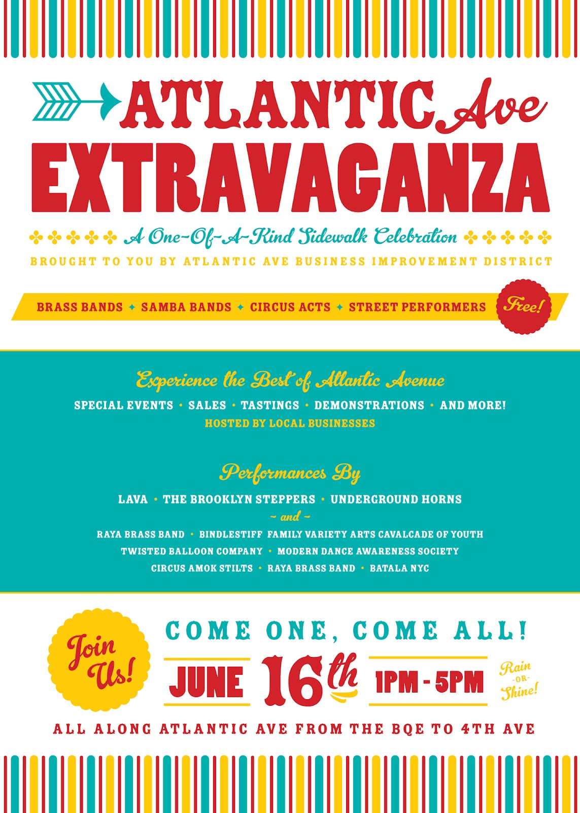 We will be playing @ the Atlantic Ave Extravaganza, a block party in downtown Brooklyn, June 16th, 2-4pm. Bring your block party dancing shoes. Hope to see you there. Atlantic Avenue Extravaganza Come 16 June, the new Atlantic Avenue Business Improvement District will be throwing a street party to end all street parties (you know until the Atlantic Antic rolls around in the fall). The Atlantic Avenue Extravaganza runs from 1pm to 5pm and includes special events, performances, demonstrations, tastings, tours, games, and more. Expect a ribbon cutting ceremony led by Brooklyn Steppers Marching Band on the sidewalk in front of the Atlantic Avenue BID’s office at 340 Atlantic Avenue (between Smith and Hoyt Streets), a sidewalk parade, the official unfurling of the BID banners, and the “Sanitation Dance”, a choreographed piece by the modern dance awareness society in which the new Atlantic Avenue BID sanitation uniforms will be unveiled. Other performers include: the stilt walkers of Circus Amok; the acrobats of LAVA; Bindlestiff Cavalcade of Youth All-Stars; the Balkan sounds of Raya Bass Band; Batala NYC, an all-female percussion band, and Underground Horns, the brass band renowned for its Afro Funk Bhangra New Orleans grooves. Artists from Brooklyn Waterfront Artists Coalition – more commonly known as BWAC – will also participate. Here is a list of local businesses, including food and services (soccer fans, take notice of Upper 90′s large screen featuring live broadcast of the Euro 2012 Championships):