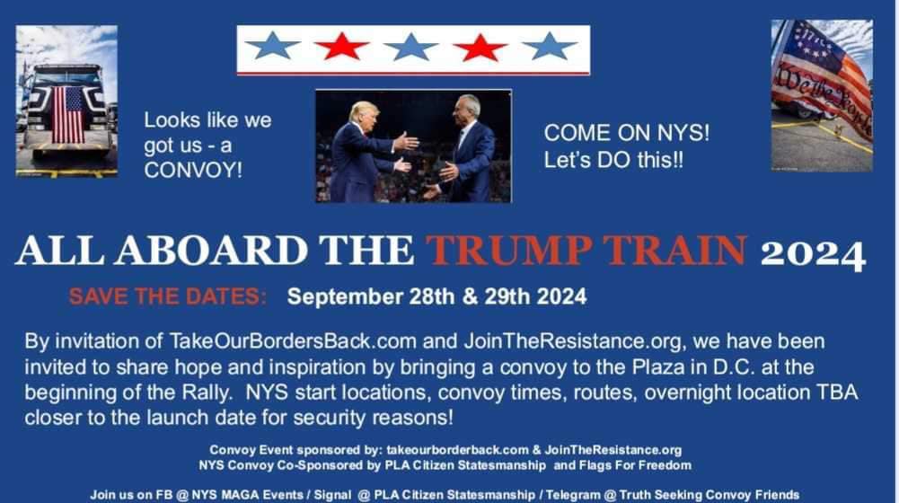 And Take Our Border Back .com and NYS MAGA Events are having a Summit September 27th, 28th and 29th in New York and Canada from the Rainbow Bridge. Take Our Border Back Summit to the Convoy to Rescue the Republic in D.C. Share hope and inspiration by bringing a convoy to the Plaza in D.C. at the beginning of the rally. Join us as we together will take our nation back together!