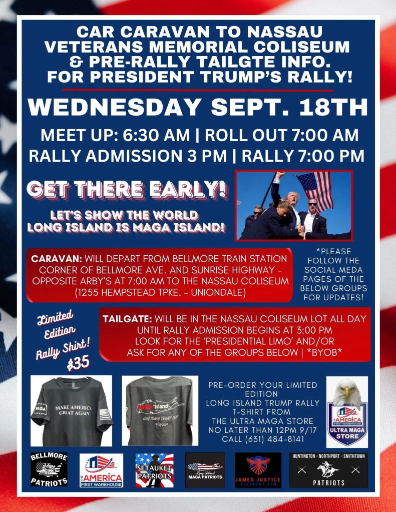 And the Trump train continues with other election related events in the New York City area. There is a Rescue the Republic event, brought to you by the Defeat The Mandates people, in Washington, D.C. at 12pm on Sunday, September 29th. And according their Facebook event invite, the stage will be located northeast of the WWII Memorial (east of 17th Street) and open viewing will extend all the way to the Washington Monument. The program will consist of a mix of musical artists, comedians and thought leaders such as Dr. Bret Weinstein, Robert F. Kennedy Jr., Russell Brand, Dr. Jordan Peterson, Tulsi Gabbard, Charlie Kirk, Matt Taibbi, Skillet, Tyler Fischer, Jack Posobiec, Eric Bolling, Del Bigtree, Rob Schneider, Col, (Ret.) Douglas MacGregor, Lara Logan, Zuby, Dr. Robert Malone, Dr. Pierre Kory, Tennessee Jet, Dr. Heather Heying, Five Times August, Brandon Straka, Jimmy Dore, DPAK, Struggle Jennings, The Defiant, Mary Holland, Corey Deangelis, Garry Lineham Human Garage, Tiffany Justice, Jennifer Sey and others.