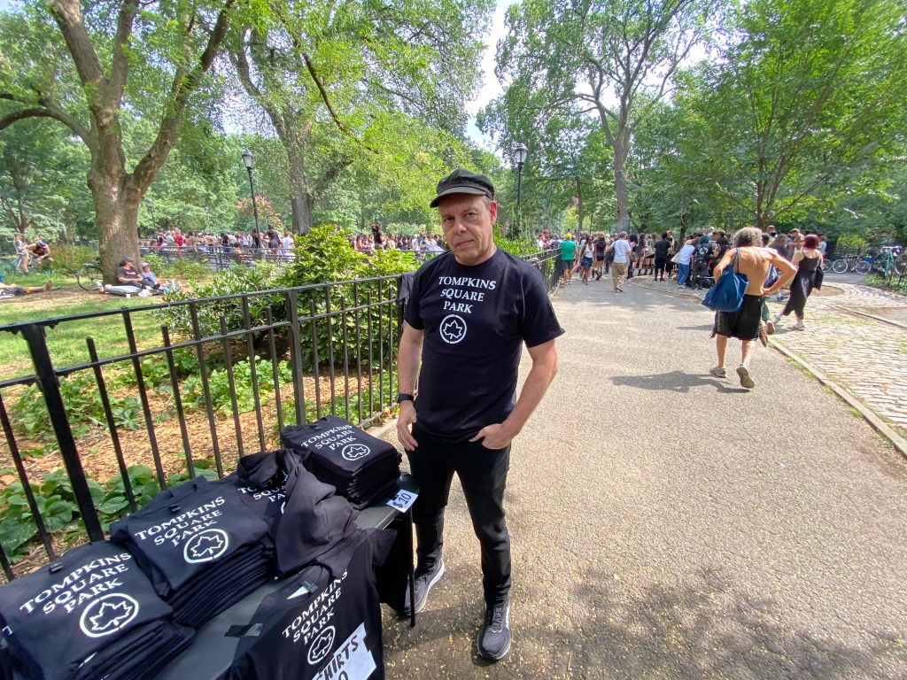 And I am planning to vend banned Tompkins Square Park t – shirts for $10 each at, well during, the annual Tompkins Square Park riot Reunion anniversary concert August 2nd and 3rd, 2 -6pm.