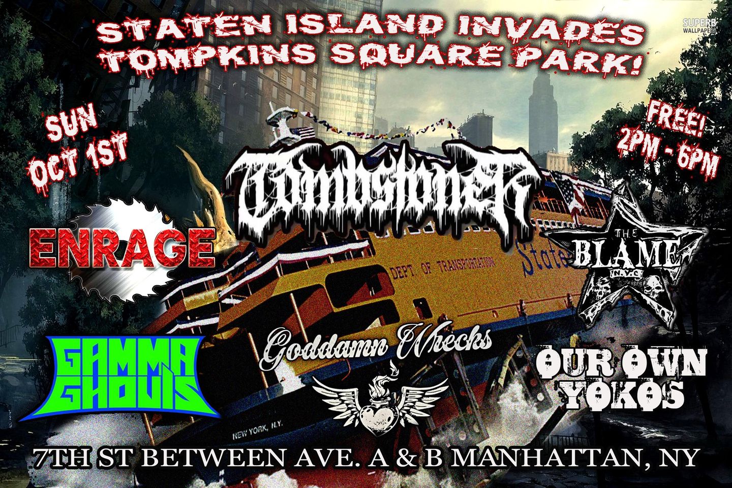So I put together some bands to represent Staten Island and play a free show at Tompkins Square Park in Manhattan, in hopes of bridging the gap and getting bands to possibly exchange shows with bands from other boroughs and for fans to see bands we have here. So, since you won’t come to our house, we’re coming to yours! Free and all ages!
