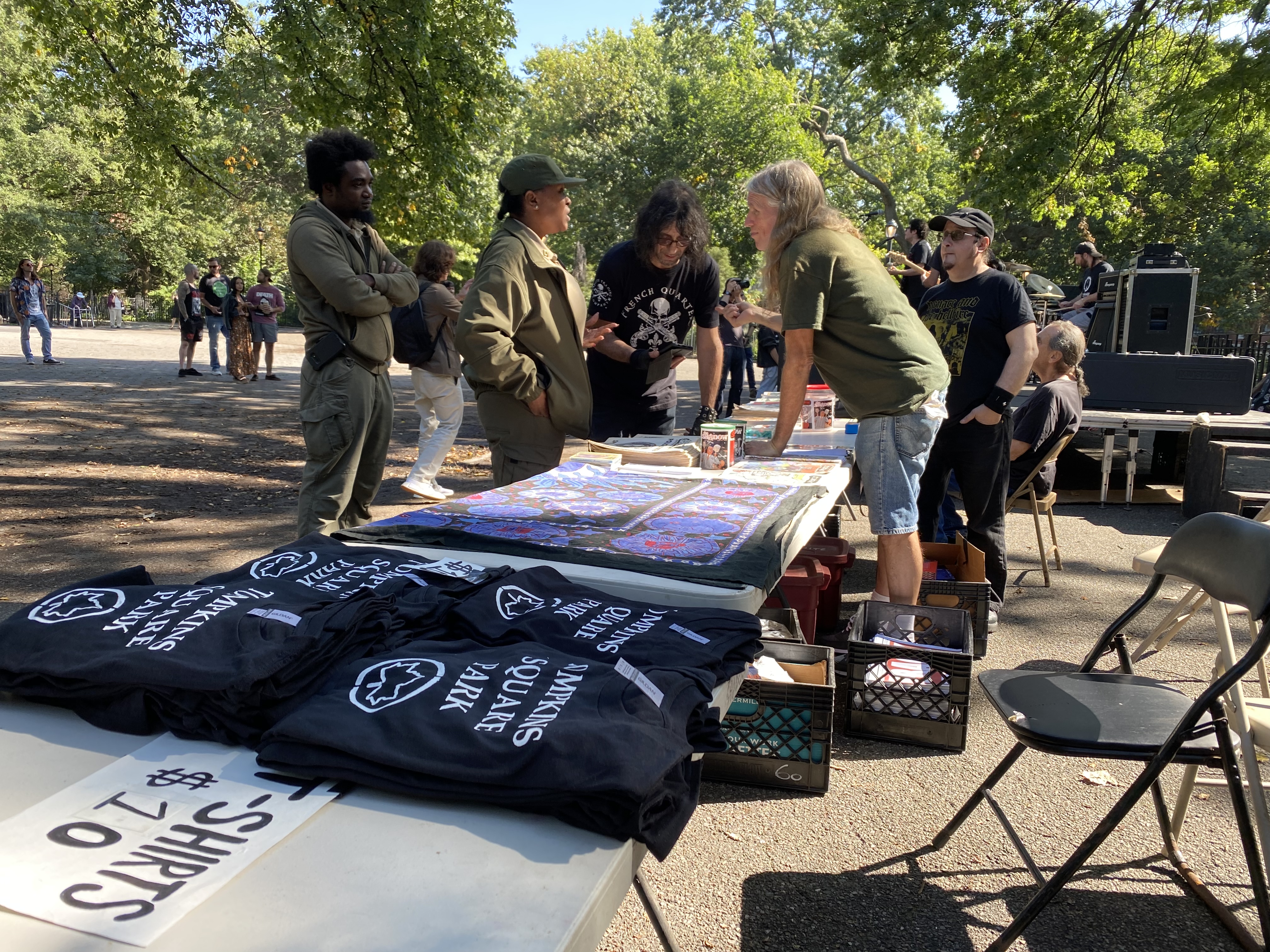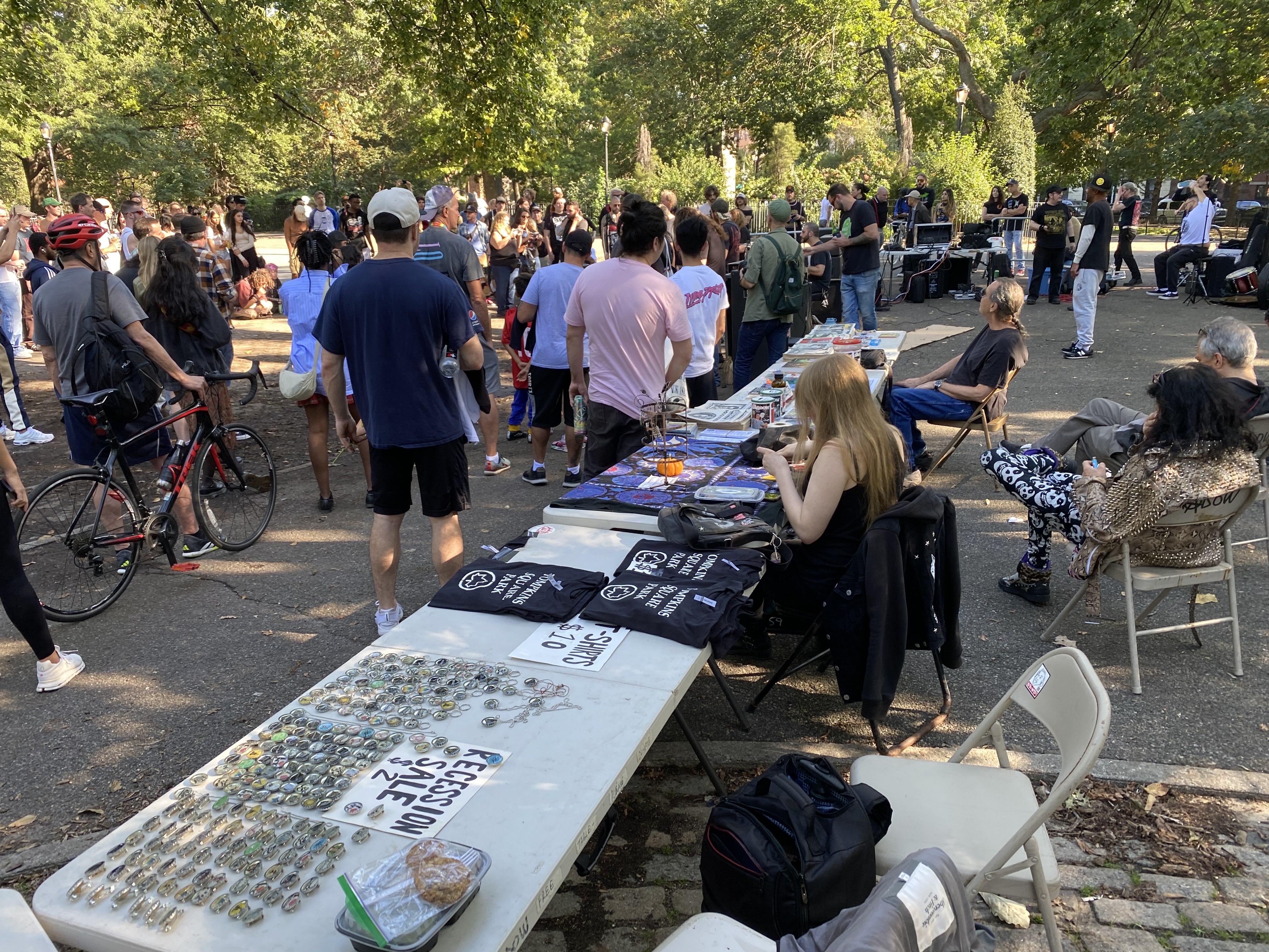 And so there was a Staten Island Invades Tompkins Square Park concert by Shows in Tompkins Square Park event at Tompkins Square Park last weekend October 1st that I found myself attempting to vend those #blacklivesmatter #S#!tJustGotReal #NotMyPresident #occupywallstreet #nopolicestate #yoga #music #morus #TheShadow #squat #tompkinssquarepark #washingtonsquarepark #unionsquarepark #eastvillage #lowereastside #brooklyn & #iloveny necklaces, magnets, key chains & pins for $2 each & Tompkins Square Park t shirts for $10 each at Shows in Tompkins Square Park at Crackhead Barney & Friends.